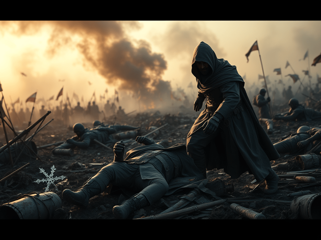 He descended into the wreckage, unseen among the fallen, his robes blending into the blood-stained mud. With the fluid grace of a shadow, he moved through the dying and the dead until he was close enough to act.